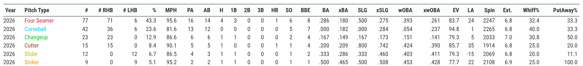 Additionally, his fastball has generated a whiff rate of 27.3%, and this is his most frequently used pitch at nearly 58%. The matchup today is against the Texas Rangers, who are posting a K rate of nearly 24% against right-handed pitchers, which ranks them 16th in baseball.