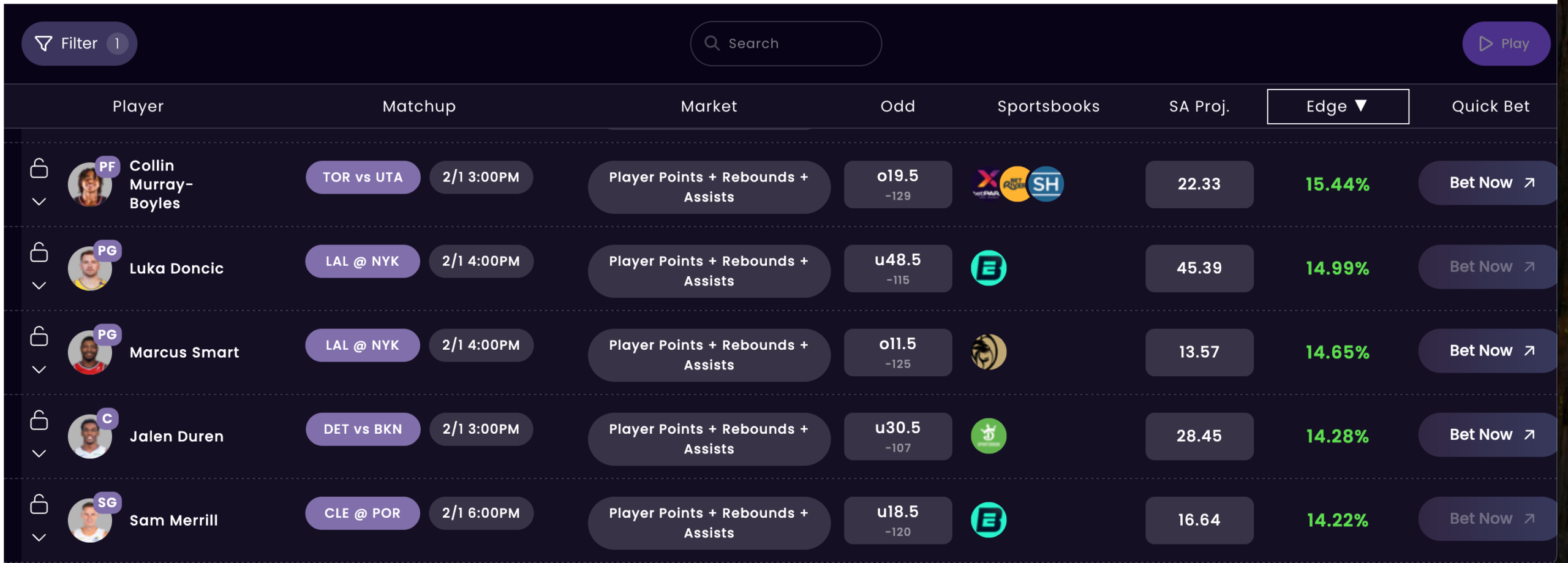 When sorting by PRA (points, rebounds, and assists), CMB shows up as one of the top options with a 15% projected edge. Our projections have him going for 22.3 PRA tonight, while his prop is still sitting at 19.5 on several sites.
