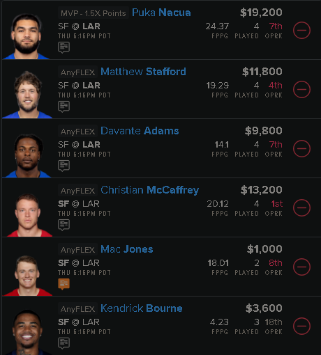 The only thing you have to worry about here is a potential blowout. With the 49ers as injured as they are, they may have a tough time keeping up. That being said, Nacua should get the ball early and often, making him one of the best plays for your MVP spot.