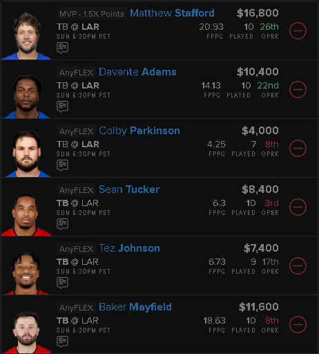 Stafford has scored 25+ fantasy points in five games this season, and although the Buccs have been solid at getting Interceptions, I don't think they will find many here. Stafford has thrown only two picks this season. This has the potential to be one of Stafford's best games of the season, which should have me locking him into the MVP spot more often than not.