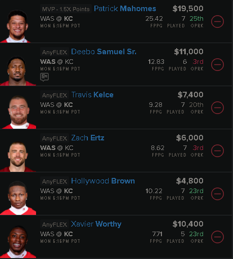 It appears that the game plan revolves around Samuel, and he genuinely gets the best matchup among the WR core. He should be lined up against Trent McDuffie tonight, and he has given up .22 fantasy points per route run this season. Going with Samuel in this spot at MVP provides a little bit of salary relief and should get you off some of the high ownership that the top two Chiefs guys will bring in.
