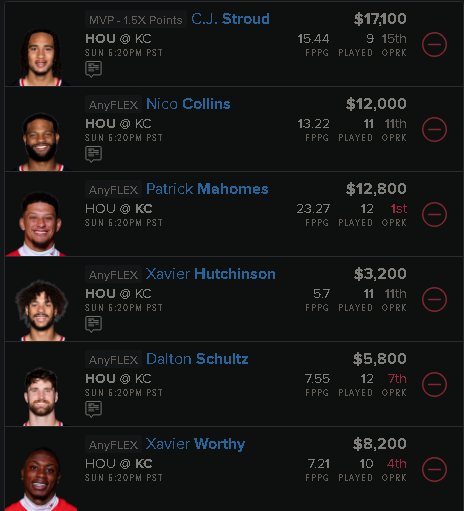I will provide you with daily fantasy football picks on DraftKings and FanDuel for Sunday Night Football in Week 14 -- Texans vs. Chiefs on December 7, 2025. These NFL DFS lineup picks can vary from higher-priced players and elite options to lower-priced players and value picks.