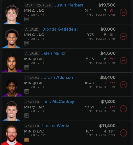 The options for Vikings players in a value spot are pretty thin. Nailor is pretty much a boom/bust play, but he does come with some perks. He has seen the second-highest red zone target share on the team this season, just behind Addison at 23.5%. The Vikings are a pretty pass-heavy offense, especially in the red zone, as I mentioned above with Addison. With the way I'm looking at building my lineups, Nailor makes fitting some of those top guys much easier with his price being so cheap.