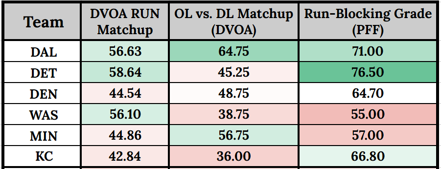 The second column is the offensive vs. defensive line matchup, calculated from each team's "adjusted line yards" created and allowed. The third column is simply Pro Football Focus' run-blocking grade for each team's offensive line.
