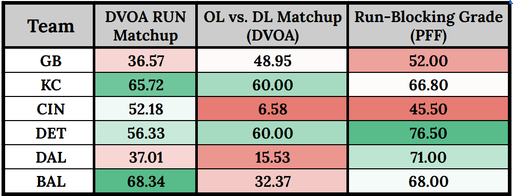 The second column is the offensive vs. defensive line matchup, calculated by using the "adjusted line yards" created and allowed by each team. The third column is simply Pro Football Focus's run-blocking grade for each team's offensive line.