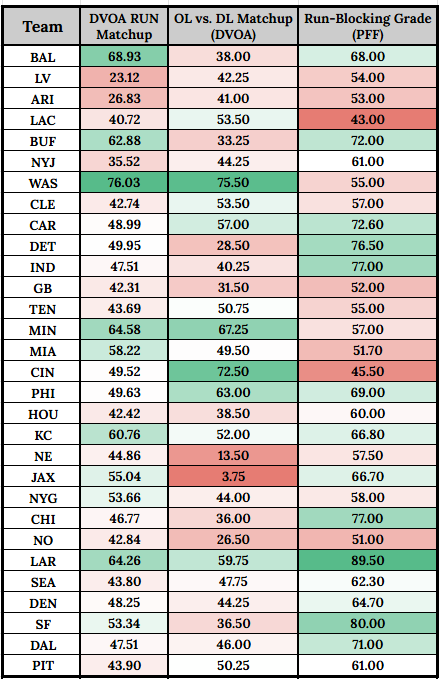 The second column is the offensive vs. defensive line matchup, calculated from each team's "adjusted line yards" created and allowed. The third column is simply Pro Football Focus' run-blocking grade for each team's offensive line.