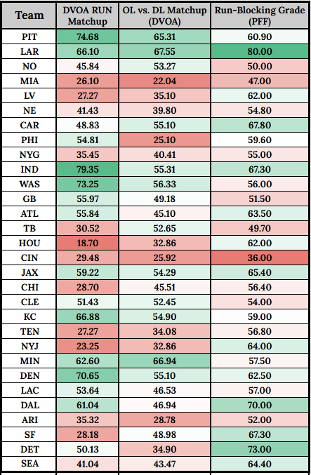 The second column is the offensive vs. defensive line matchup, calculated by using the "adjusted line yards" created and allowed by each team. The third column is simply Pro Football Focus' run-blocking grade for each team's offensive line.