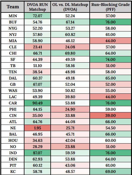 The second column is the offensive vs. defensive line matchup, calculated by using the "adjusted line yards" created and allowed by each team. The third column is simply Pro Football Focus' run-blocking grade for each team's offensive line.