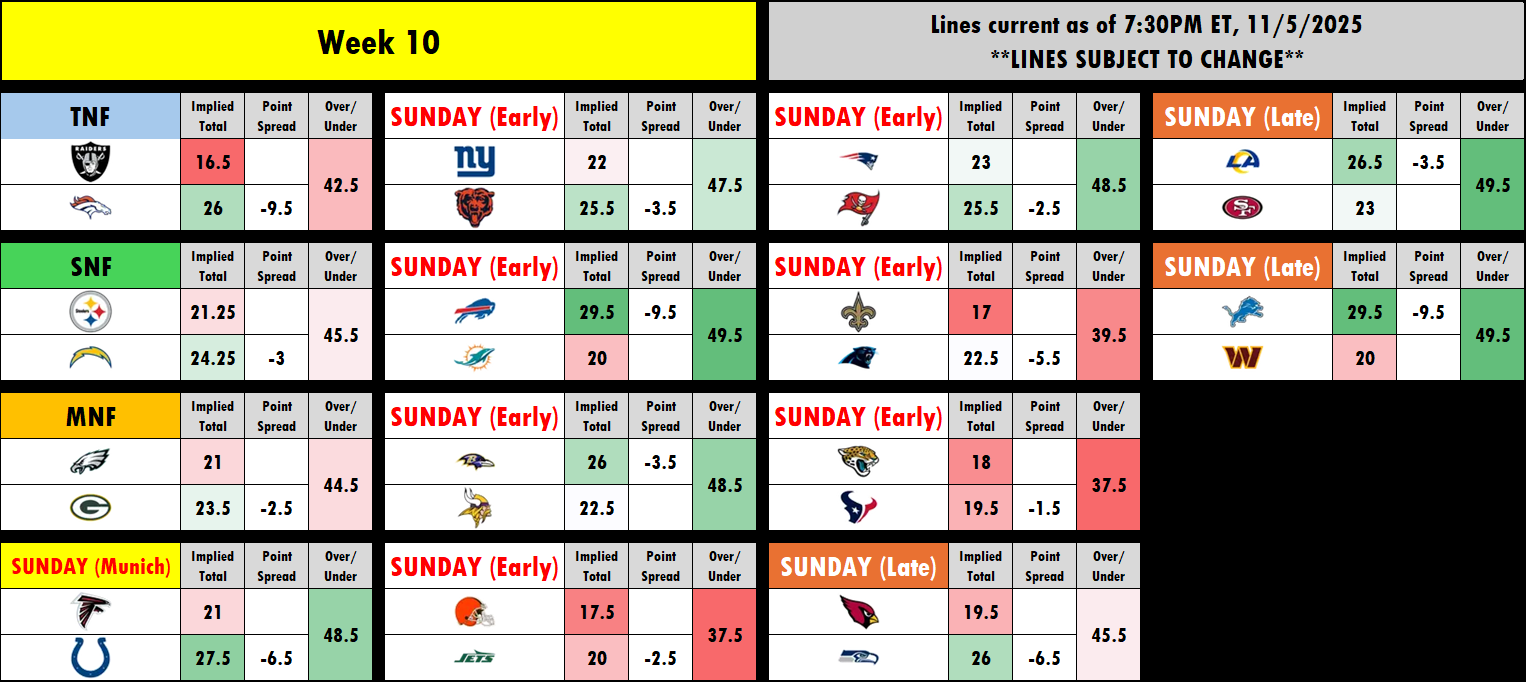 Implied Point Totals, Point Spreads, and Over/Under Totals for Week 10