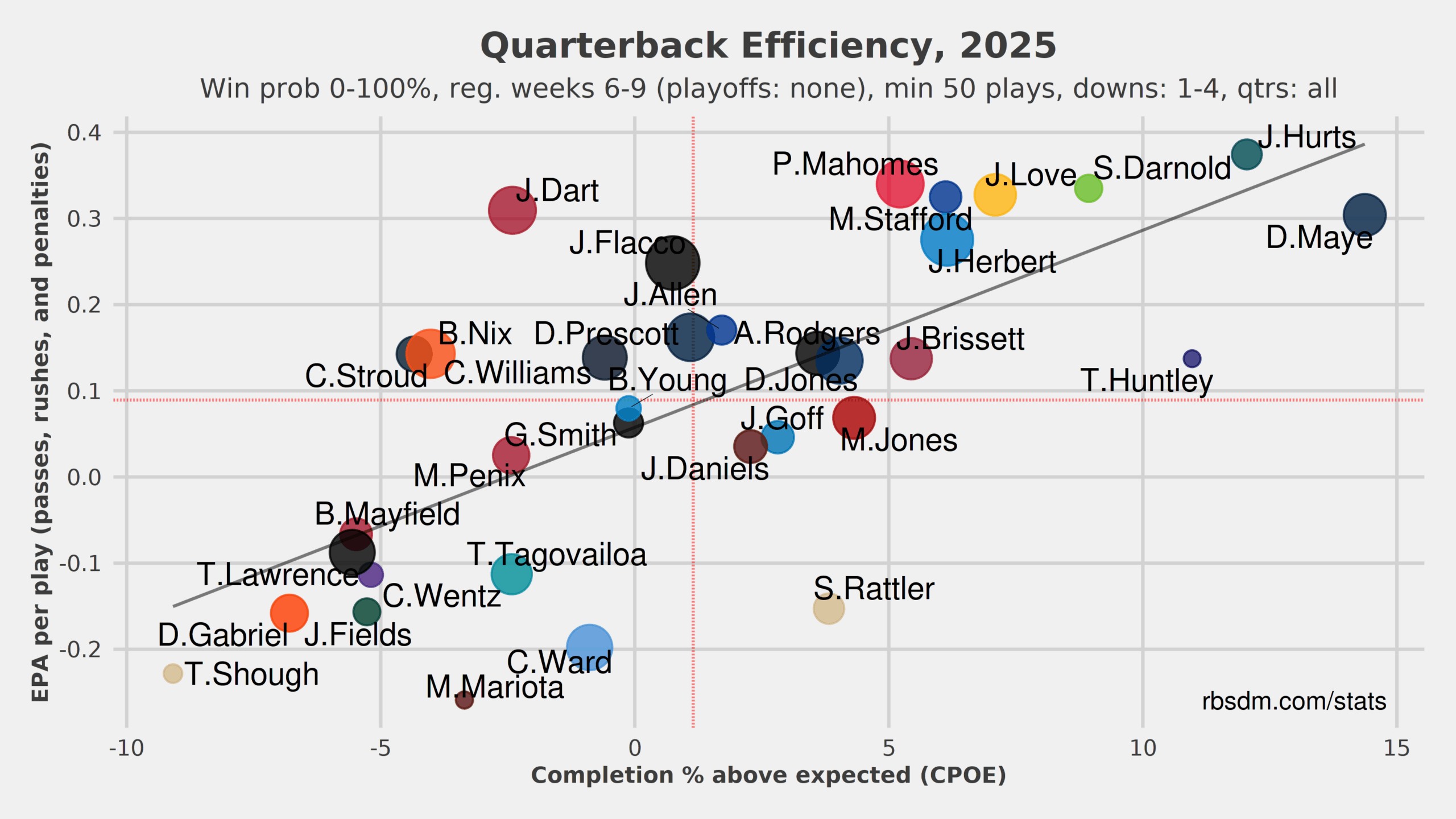 The Packers no longer seem like a team that is a lock in good matchups, as they had a gift-wrapped home game against the Panthers go awry when Rico Dowdle rolled up to put 130 rushing yards on Green Bay. To add injury to insult, they won't have the services of tight end Tucker Kraft, who tore his ACL. The Chargets lost tackle Joe Alt for the season, and the Commanders lost quarterback Jayden Daniels (dislocated elbow) in the midst of a 38-7 home blowout to the Seahawks.