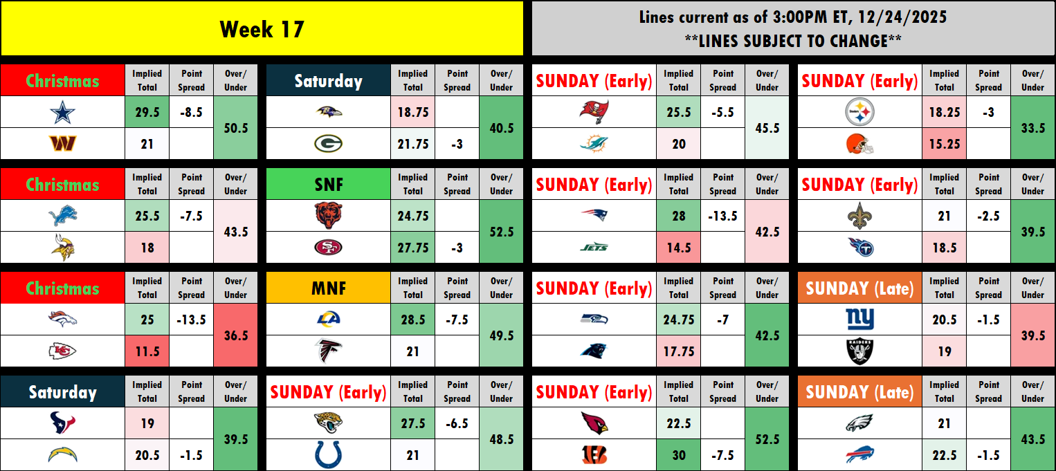 Implied Point Totals, Point Spreads, and Over/Under Totals for Week 17