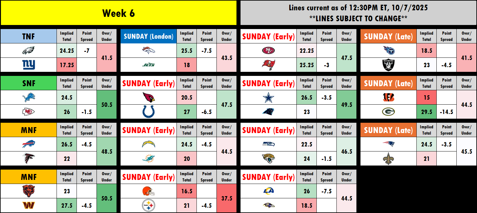 Implied Point Totals, Point Spreads, and Over/Under Totals for Week 6