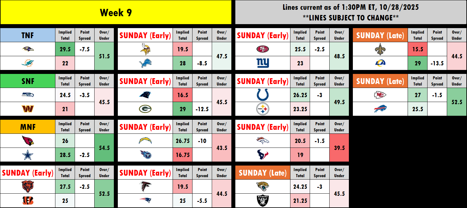 Implied Point Totals, Point Spreads, and Over/Under Totals for Week 9