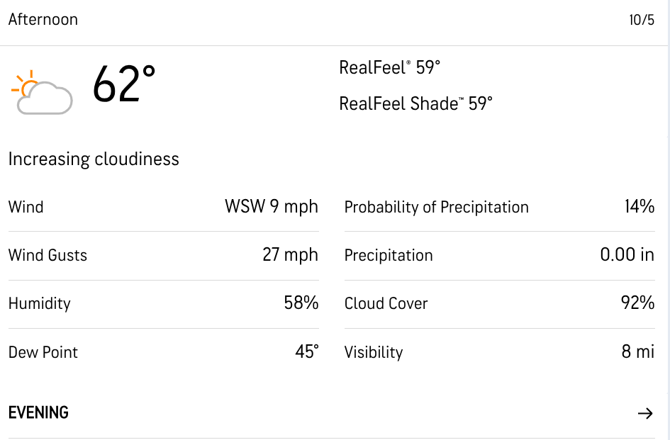 Overall, the weather for this tilt should be exceptional, with temperatures hovering around 80 degrees under partly sunny skies. The winds should be of no concern, as sustained winds are projected to be around 6 mph, with gusts near 14 mph.