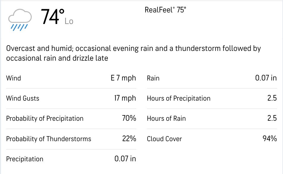 AccuWeather tells us that temperatures should be in the mid-70s; however, we could see some rain. Currently, there is a possibility of a thunderstorm or two during the game, which is not all that surprising this time of year in Florida.