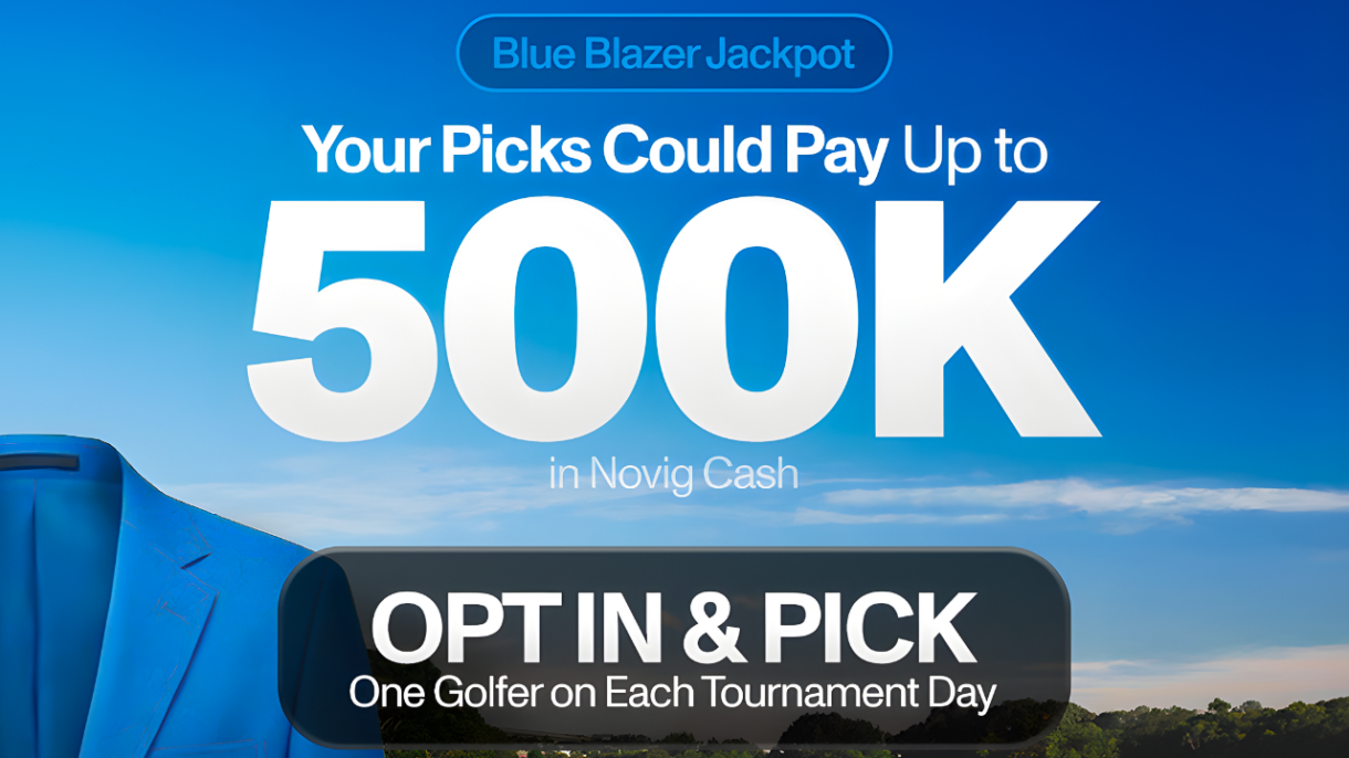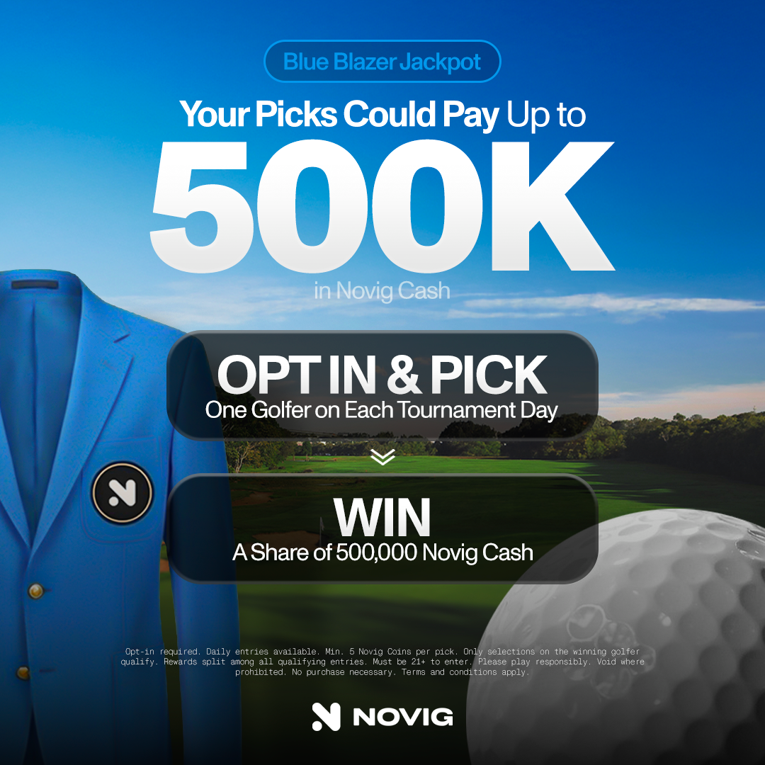 Visit Novig to play in the 2026 Masters Blue Blazer Jackpot and win up to $500K. Opt in and pick one golfer for each tournament day to increase your chances at the prize pool.