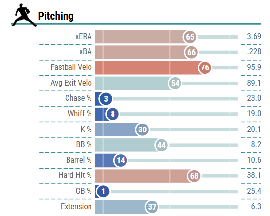He struck out 85 hitters (37.3% rate) while allowing walks at a low 6.6% rate, placing him in the 74th percentile among qualified pitchers. His 2.11 xERA and .175 xBA placed him in the 99th percentile or higher, and his strong 5.5% barrel rate placed him in the 89th percentile among qualified pitchers.