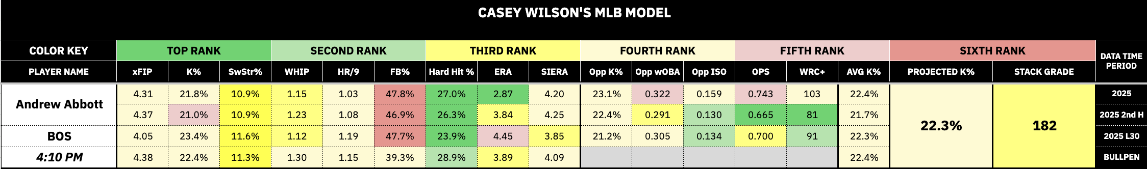 Above is a snippet from my model for the Red Sox's matchup against Andrew Abbott. Every matchup can be found here for those who want to dig in further and research on their own.