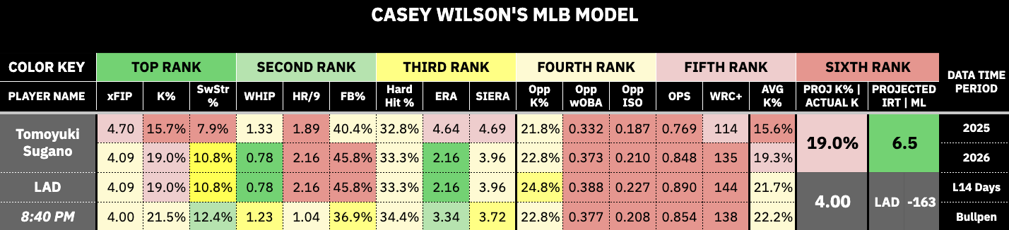 Tomoyuki Sugano has been solid in 2026, pitching to a 4.09 xFIP, 0.78 WHIP, 2.16 HR/9, and a 45.8% FB%. The problem here is that he is allowing a ton of fly balls, and now he will face an offense that has an .828 OPS and a 130 wRC+ against RHP this season.