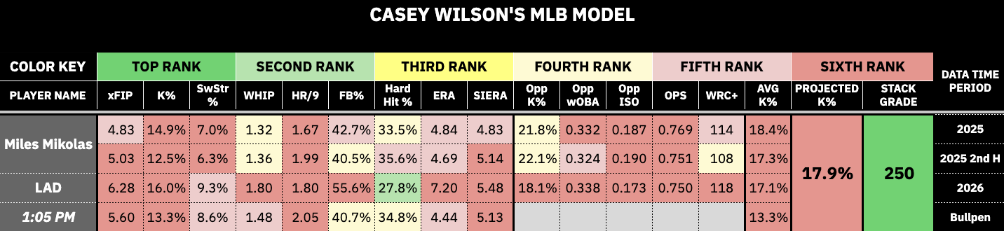 Mikolas is a pitcher who does not miss many bats, and against this Dodgers team, that is not a good recipe for success. Mikolas pitched to a 4.83 xFIP, 7.0% SwStr%, 1.32 WHIP, and a 1.67 HR/9 in 2025. In his first start of this season, he posted a 6.28 xFIP, 9.3% SwStr%, 1.80 WHIP, and a 1.80 HR/9.