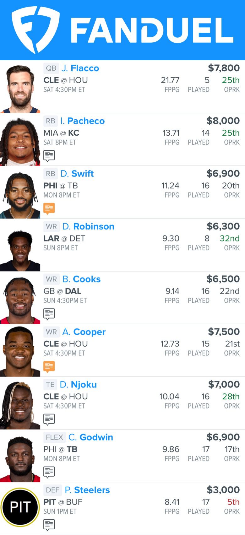 FanDuel Lineup