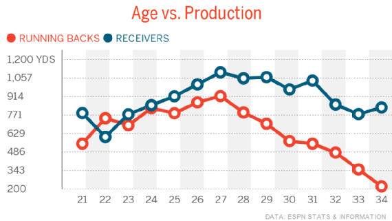 So you’re a few levels of awareness deep now, because expecting last year’s gaudy passing stats out of Forte should not be in your mind. However, you’re probably looking at me a little funny right now, because those numbers really aren’t anything to scoff at. Well if you could draft “peak Forte” then yes, you might have a case, but you’re drafting a bit of an elder statesman here as far as RB years go, and you always need to be conscious of this. ESPN Stats & Information put together “Age vs. Production” data a while ago, which can be viewed here, that shows how running backs peak at 27, and then fall off a pretty sharp cliff. Again, you’re a savvy fantasy vet, you knew that general idea, but we all need reminders sometimes.