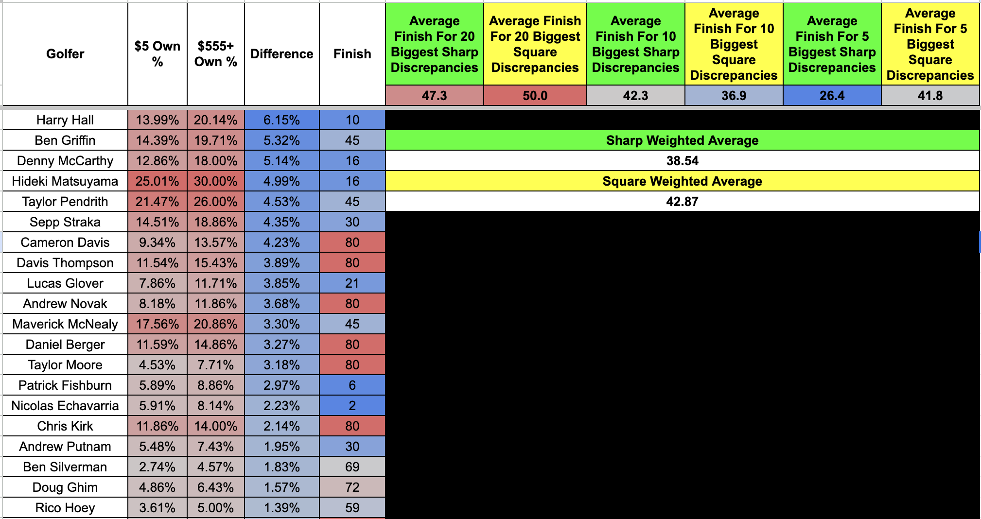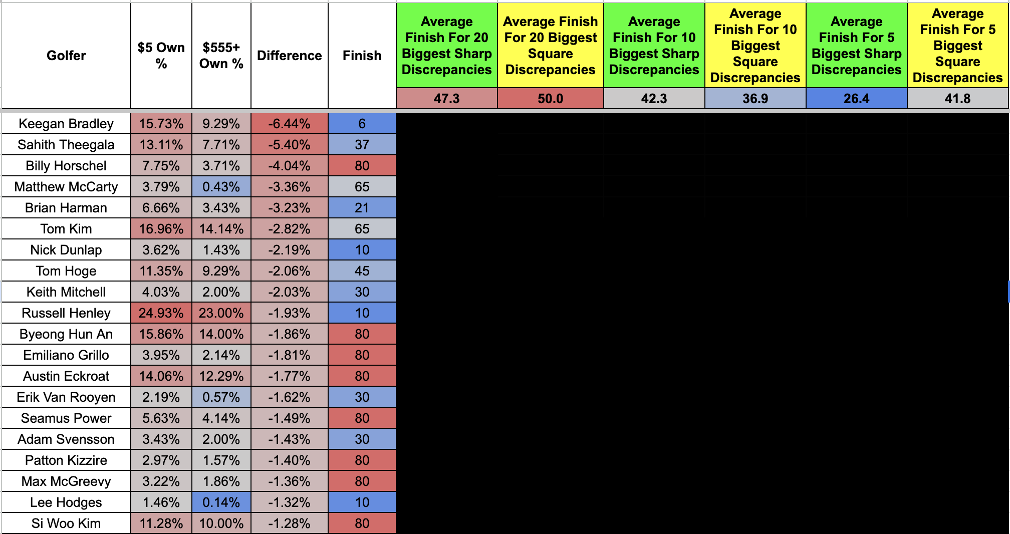 One thing you might notice is the direct comparison we get for every golfer in the field. The larger ownership difference between the $555+ contests and the sub-$5 games, the more heavily my model considers that golfer "sharp." Image one would be the sharpest players for the week. Image two is the inverse of that, where those names were the "squarest" golfers on the board. This is no different than when someone dives into "Pros vs. Joes" data for NFL betting and follows where the "big money" is landing.