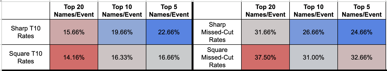 Squares posted overall top-10 rates at a sub-two percent difference when comparing their outputs to sharps, averaged around only one more missed cut per event than sharps did when grading the 20 biggest stances on the board for each side, and actually found quality pockets of success throughout various events this year.
