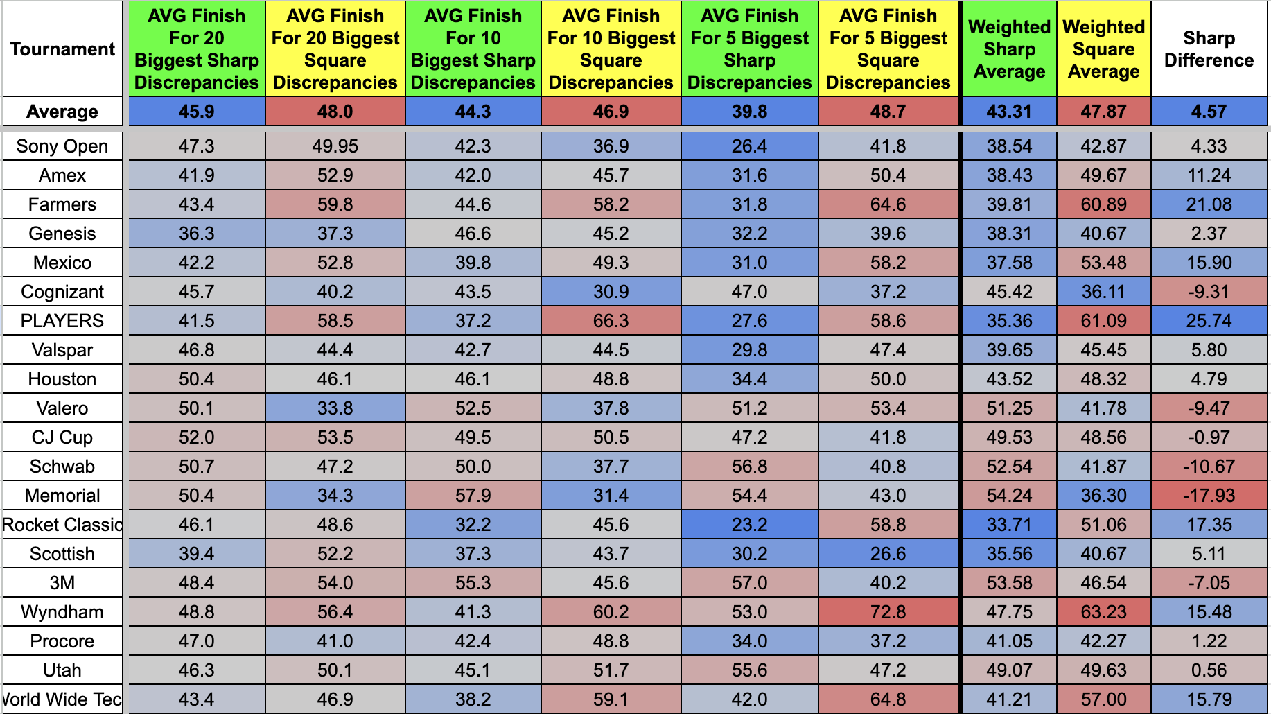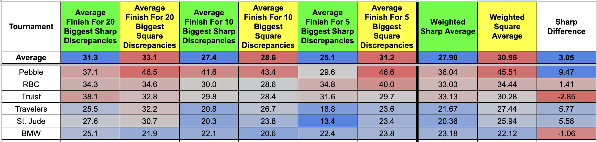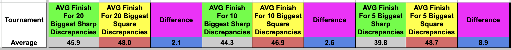 For comparison sake, an average top 20 edge for both sides landed the sharps 4.1 spots higher on the leaderboard in making better decisions. When using only 10 names, it actually shrunk to 3.3 spots for the sharps advantage. And last but not least, we saw it rise to a staggering 11 spots when using only the top five golfers for each side.