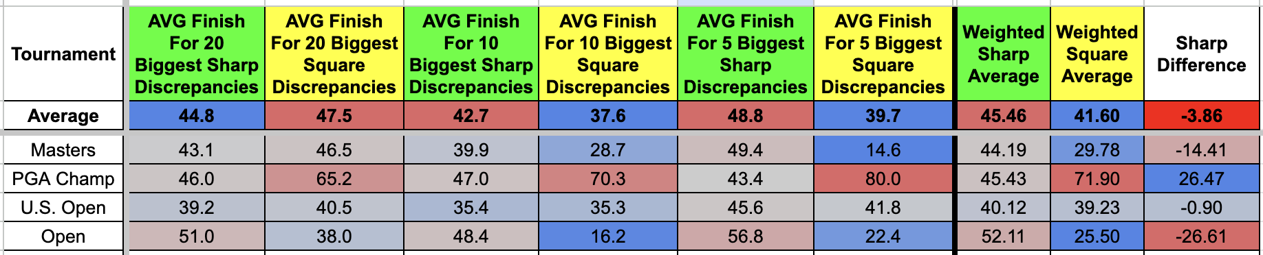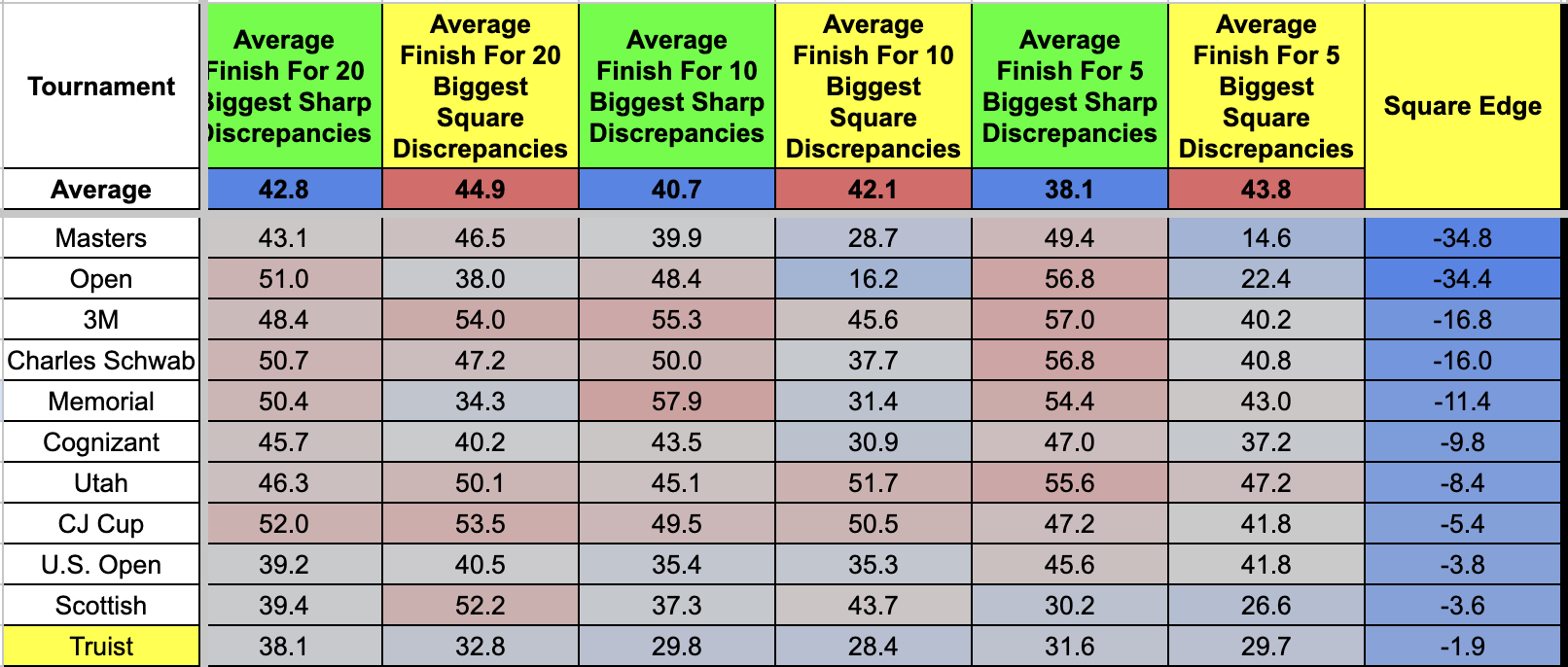 Square users won three of the four meeting this year (75%) and actually flipped the script from every other output we have seen of top-five discrepancies massively pushing in the favor of sharp users. In fact, squares substantially posted their best marks of the season for those high-end differences, with those Masters and Open showings nearly doubling the expectation elsewhere.