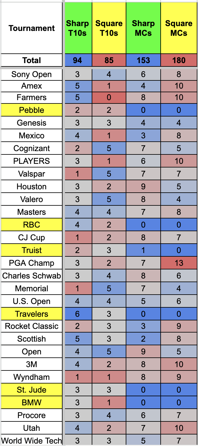 What that chart is looking at above would be your 20 "sharpest" and "squarest" plays on the board for a given event over a 30-tournament sample size in 2025. Anything in yellow just means a tournament didn't have a cut that week.