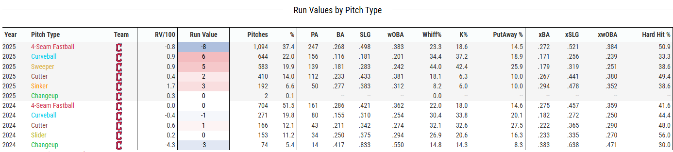 This Baseball Savant data helps emphasize how bad the fastball was in terms of its run value and batted ball data. An xSLG of .521 and a hard-hit rate of 50.9% is concerning, even if his offspeed stuff was really good.