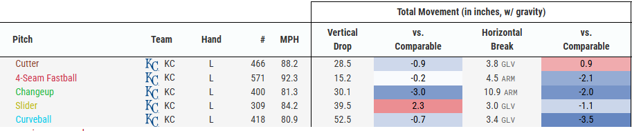 I do like that he has a balanced arsenal of pitches, throwing no pitch more than 26% of the time. However, he has a very weak fastball, so he had to rely a lot on his cutter and breaking pitches. That would be fine if he had some really dynamic breaking balls, but that's not really the case.