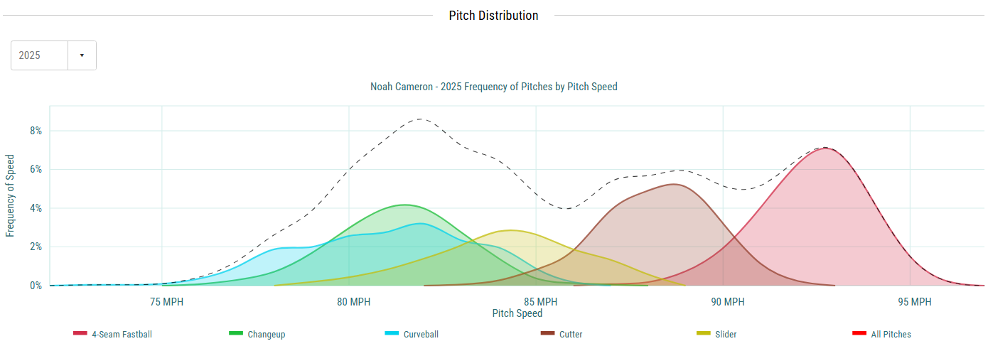Despite the below-average movement, his changeup did elicit a 20% SwStr%, but the curveball and slider don't miss bats nearly as often. Since he tops out around 92 mph on his four-seamer, there's only around a 10-11 mph difference in his fastest and slowest pitches. I think the more exposure MLB hitters have to Cameron, the more they'll be able to sit back and wait on his offspeed stuff, as he doesn't have the velocity to keep them honest with his heater.