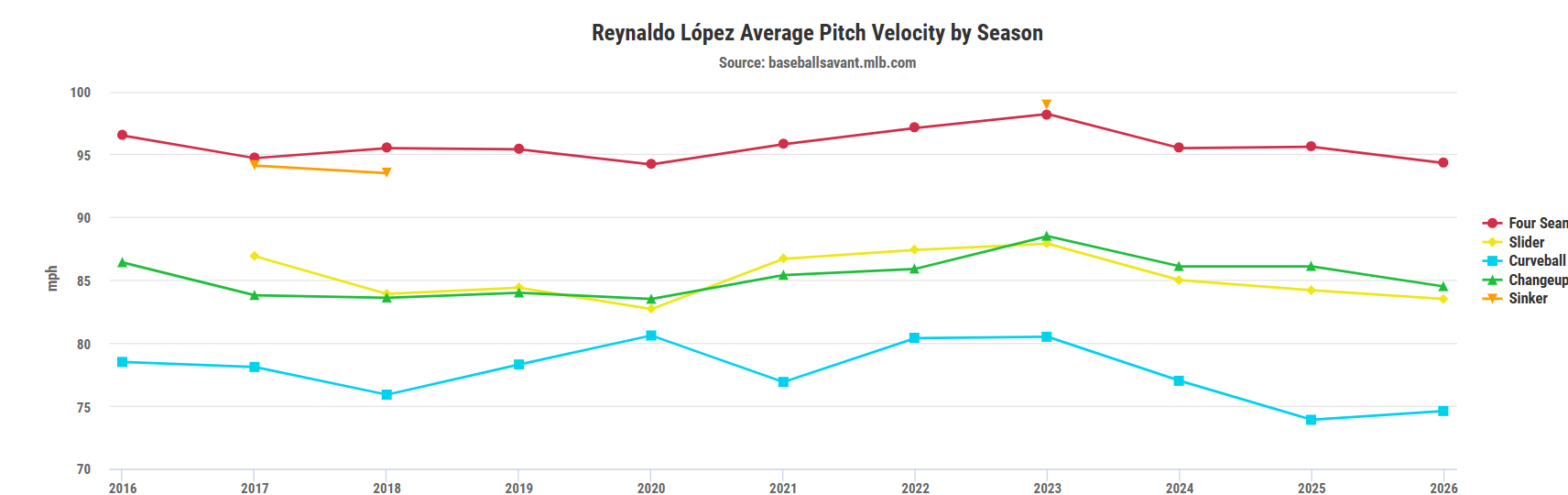 His pitch mix has looked nearly identical to his 2024 usage, making his profile straightforward to analyze. In 2025, Lopez has leaned on his four-seamer (51.7% usage), compared to a similarl 55.2% usage rate back in 2024. So far, this pitch has clocked in at 94.3 MPH, a slight drop from the 95.5 MPH it held two seasons ago.