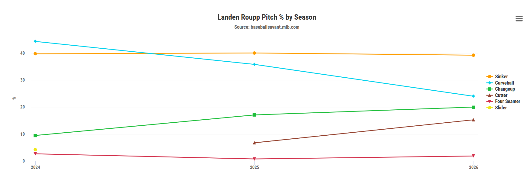 Even though he is deploying his curveball less than in 2024, it may behoove Roupp to turn to this dominant pitch more often. So far, this breaking ball has generated a near-perfect .157 xwOBA with a 31.8% whiff rate, a nice drop from the .267 xwOBA it held in 2025. However, his changeup and cutter have been very effective in their own right, with a .199 xwOBA and a .275 xwOBA, respectively.
