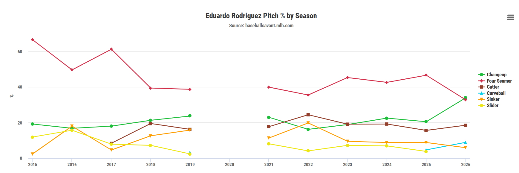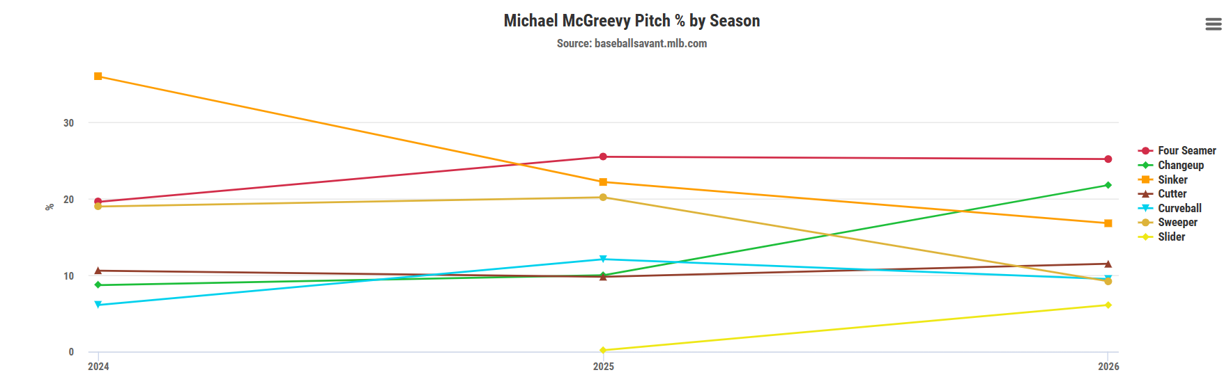 McGreevy relies on a vast number of pitches, throwing four of them over 10.0% of the time and throwing seven at least 6.0% of the time. The primary pitches in his pitch-mix are his four-seamer (25.2% usage), changeup (21.8% usage), sinker (16.8% usage), and his cutter (11.5% usage). Compared to his 2025 pitch mix, he has slightly altered it, relying more on his changeup and reducing his use of the sweeper and sinker.