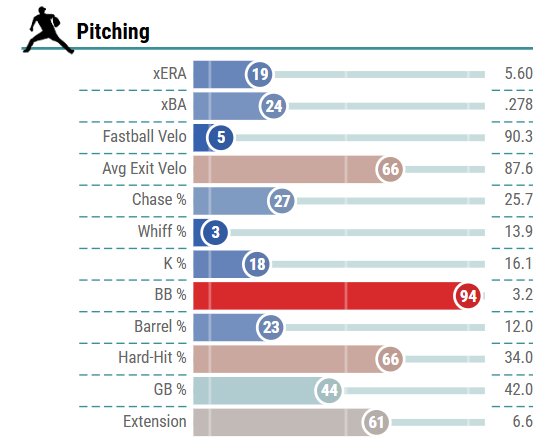 Overall, McGreevy sits in the 19th and 24th percentiles in xERA and xBA, respectively, and has allowed a high barrel rate of 12.0%. As shown below, these marks do not place him in the best company among qualified starting pitchers.