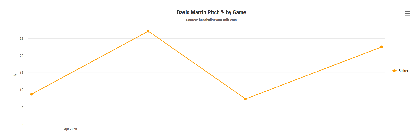 However, when diving deeper into his pitch-mix, we can spot even more glaring signs that suggest Martin is far from a "top" waiver wire pickup this week. Currently, the right-hander relies on five pitchers more than 12.0% of the time and mixes in a sixth pitch (a curveball) at a 9.8% rate.