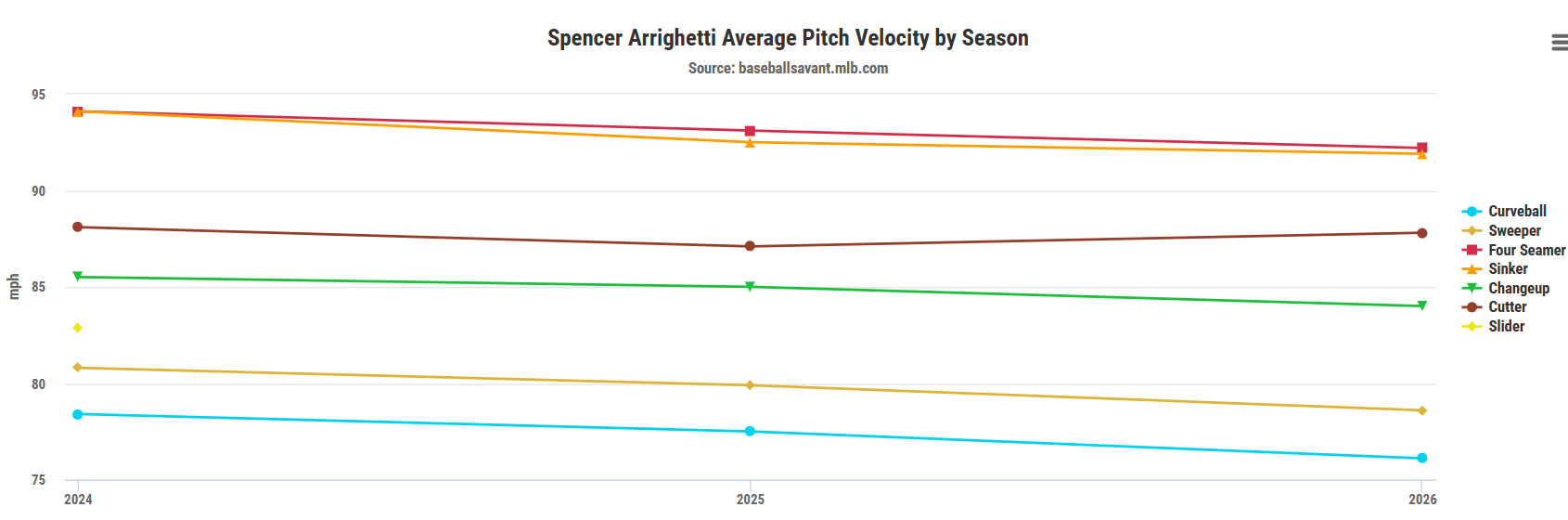 His four-seamer clocked in at 92.2 mph, which is a 2.0 mph drop from 2024 and generated a .581 xwOBA. While the curveball saw a similar drop in velocity, it was actually even more effective than it has been in the past. Arrighetti will need to rekindle this four-seamer to fully put together a breakout season.