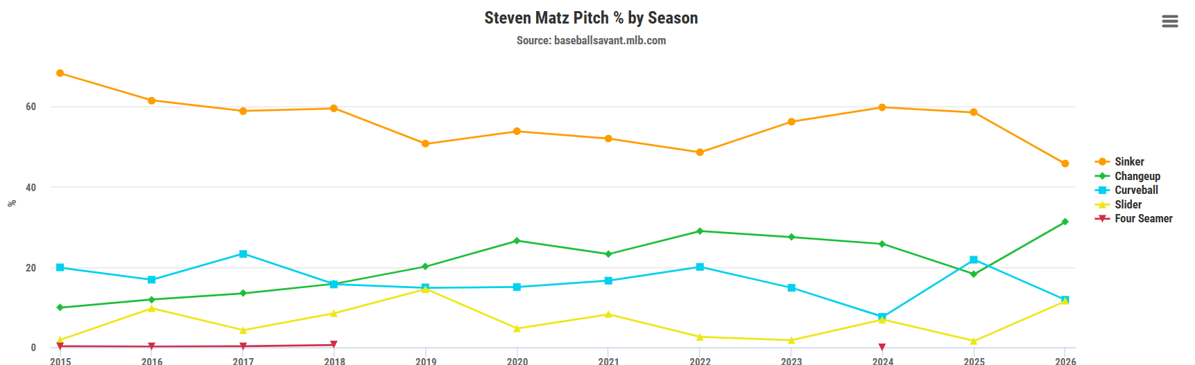 As he has for most of his career, Matz has continued to rely on his typical four pitches, his sinker, changeup, curveball, and slider. His sinker continues to lead the way, carrying a 45.6% usage rate while his changeup slides in as his No. 2, at a 31.2% usage clip. His changeup and slider are distant No. 3 and No. 4 pitches, with usage rates of about 11.8% and 11.5%, respectively.
