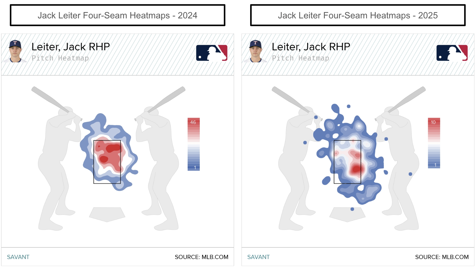 Furthermore, Leiter has been throwing the four-seamer in the zone less often by nearly seven percentage points to 50.8 percent in 2025. Leiter threw his four-seam in the upper third (an ideal spot), 29.1 percent of the time in 2024. However, his four-seamers were thrown in the upper third only 14 percent of the time in 2025.