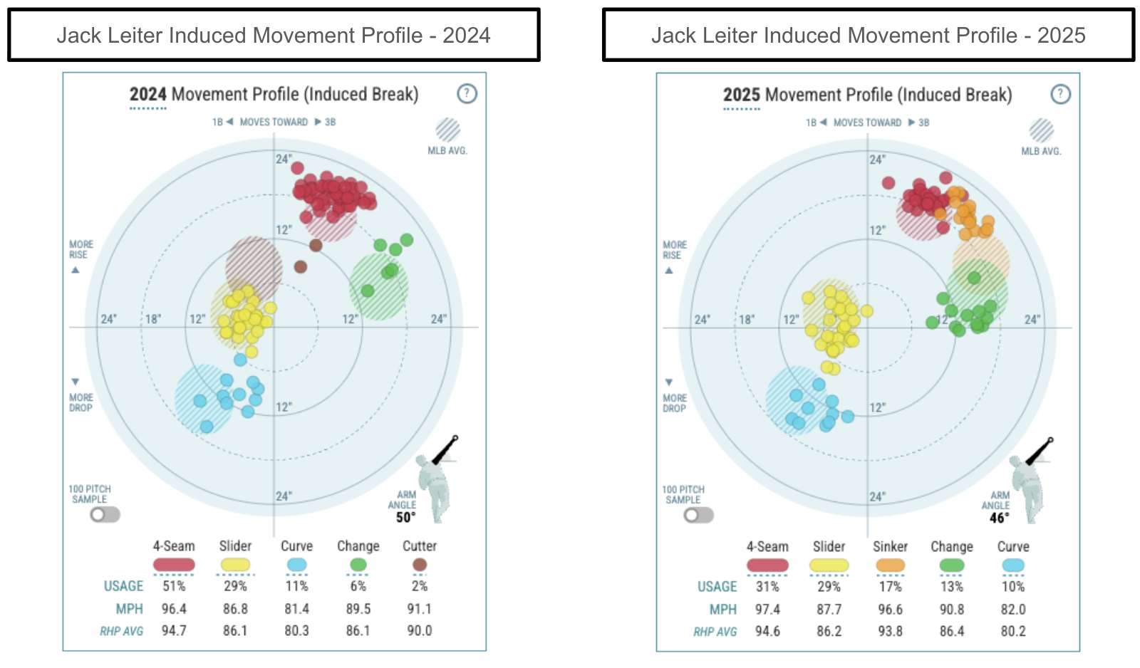 Leiter's four-seam lost a half-inch of induced vertical break (IVB) with the slight arm angle change. His four-seam still possesses above-average IVB, which theoretically should bode well with the high extension. However, Leiter's four-seam locations have been the issue. Location aside, Leiter's four-seam lost three percentage points of swinging strike rate (10.8 percent) in 2025 compared to 2024 (13.8 percent).