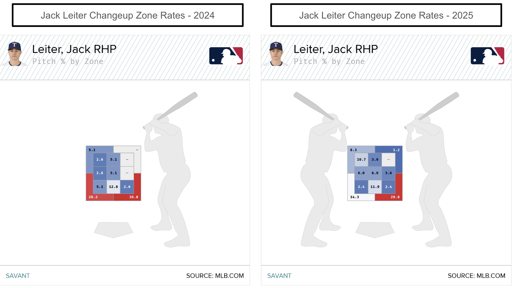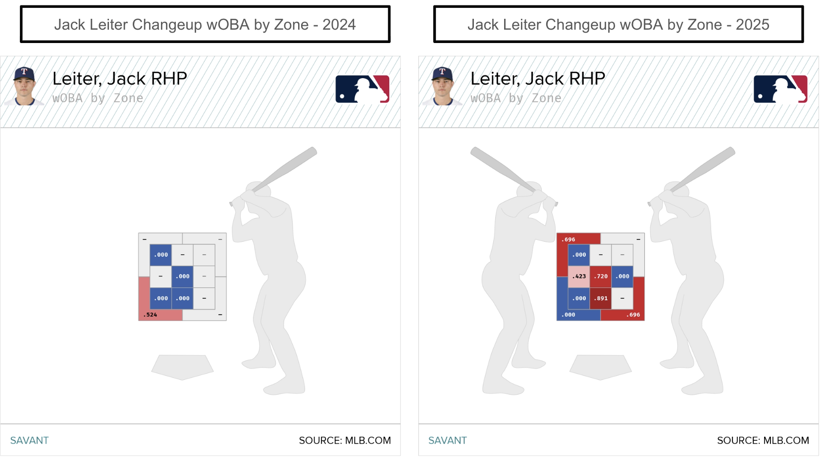 One assumes that a changeup drops more, so the locations should be in the lower third of the zone. That hasn't been the case with Leiter's changeup. Leiter's changeup zone rate jumped by 10 percentage points to 46.4 percent (2025) from 35.9 percent (2024). Hitters crushed the changeup when it was thrown in the zone in 2025, evidenced by a .434 wOBA (.353 xwOBA) versus a .000 wOBA (.222 xwOBA) in 2024.