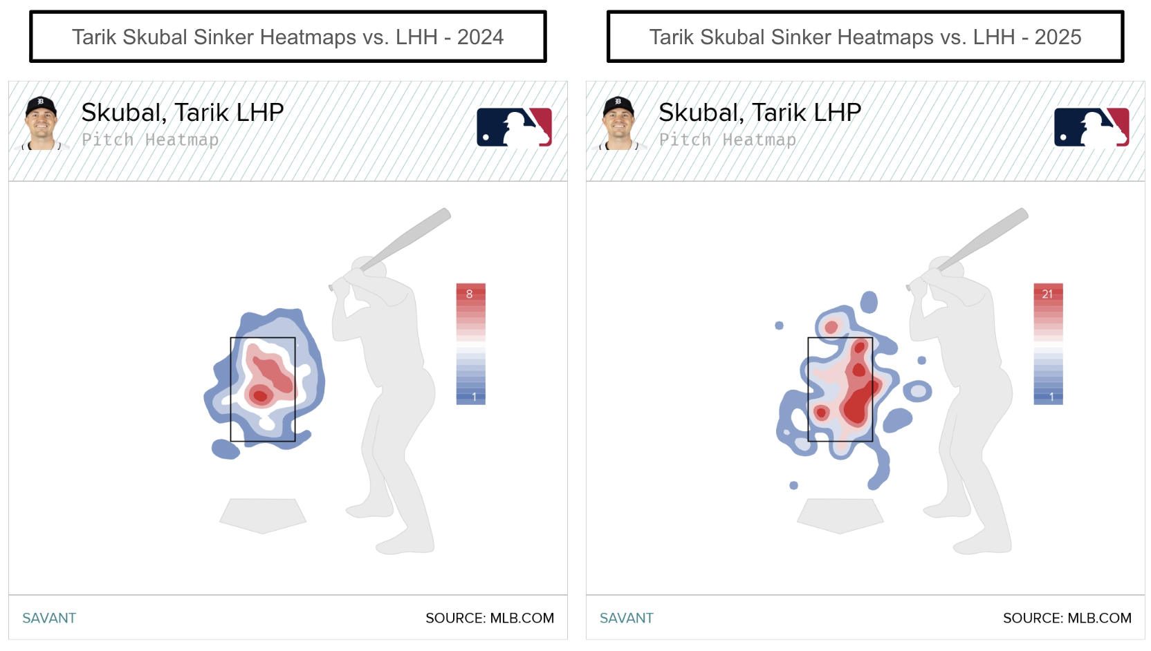 Since Skubal's sinker lost downward movement, it unsurprisingly generated fewer groundballs at 48.9 percent. That's notable because Skubal's sinker resulted in a 55.7 percent ground-ball rate in 2024, following a similarly high rate in 2023 at 75.9 percent. Besides the sinker's missing downward movement, the locations have been slightly more toward the inner half of the plate for left-handed hitters.