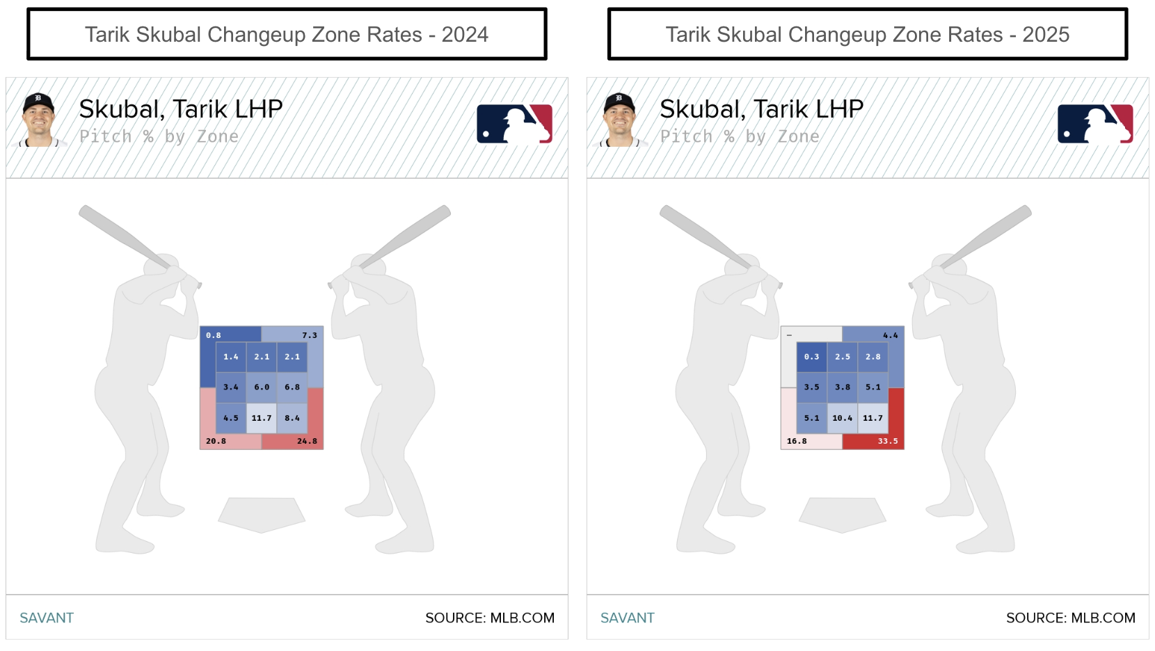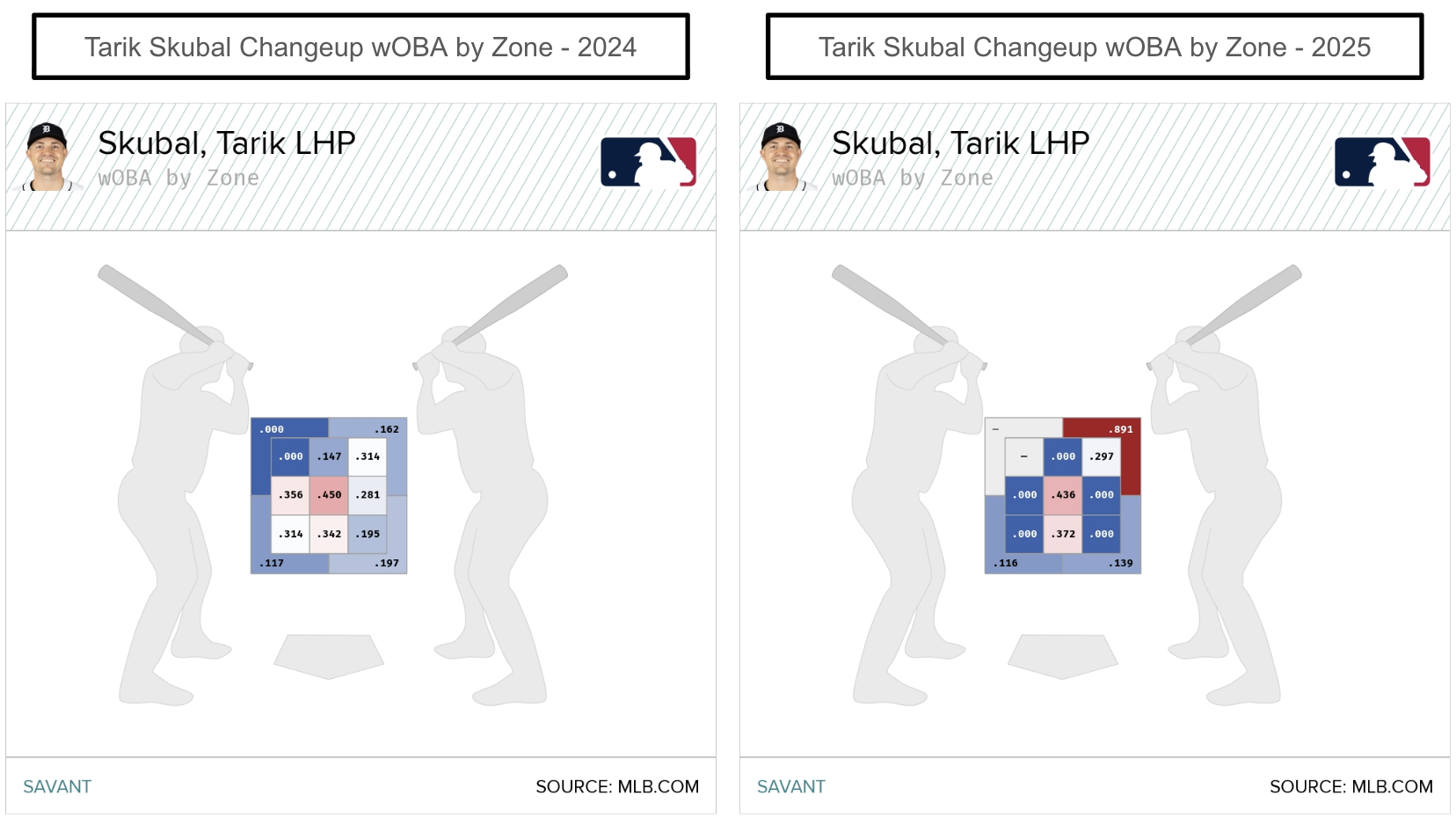 The locations have been slightly more concentrated for Skubal's changeup, throwing it down and away from right-handed hitters 33.5 percent of the time in 2025 versus 24.8 percent in 2024. Regardless, Skubal's changeup has remained effective to induce weak contact and whiffs over the past few seasons.