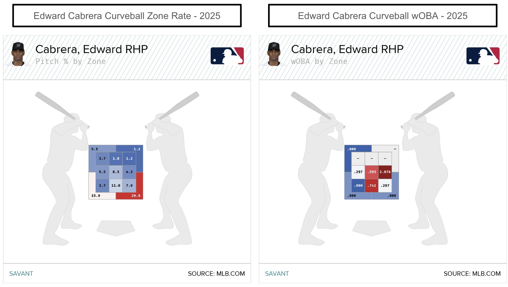 Meanwhile, Cabrera's curveball remained effective versus left-handed hitters, given the .253 wOBA allowed (.204 xwOBA) in 2025. The curveball locations haven't changed much from previous seasons, though the results have remained positive, especially when he locates it low and below the zone.