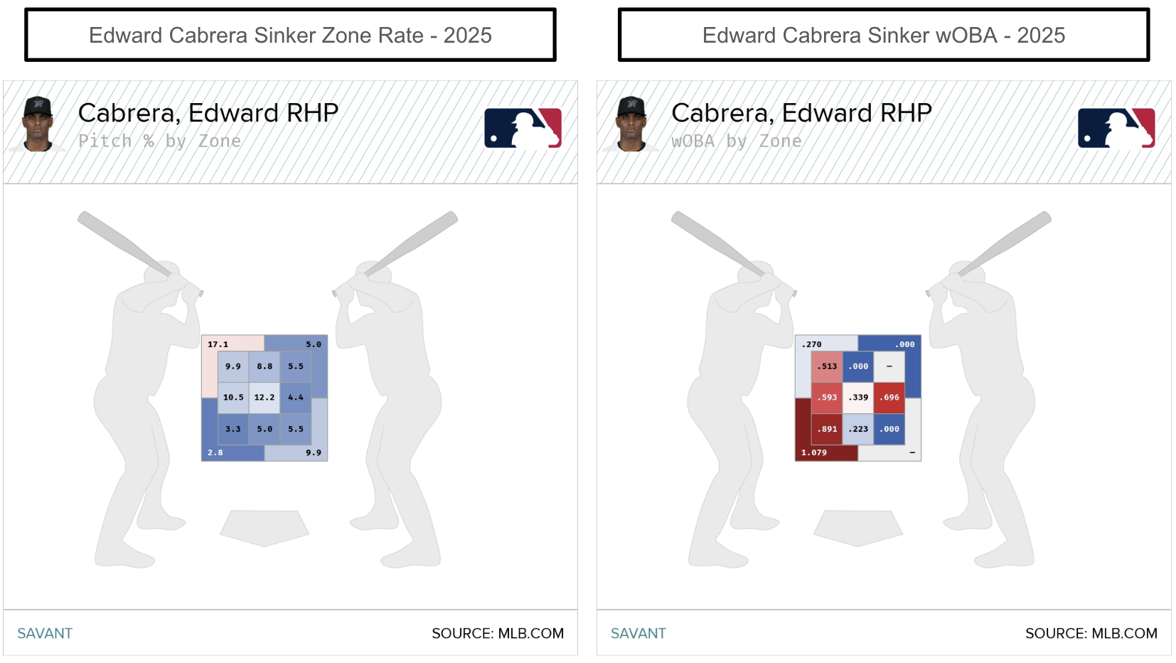 Cabrera used to throw his sinker 12-14 percent of the time from 2022 to 2024 against right-handed hitters. However, Cabrera increased the sinker usage to 28.7 percent versus righties, leading his arsenal. Unfortunately, Cabrera's sinker results have been horrible, allowing a .436 wOBA (.429 xwOBA) versus right-handed hitters.