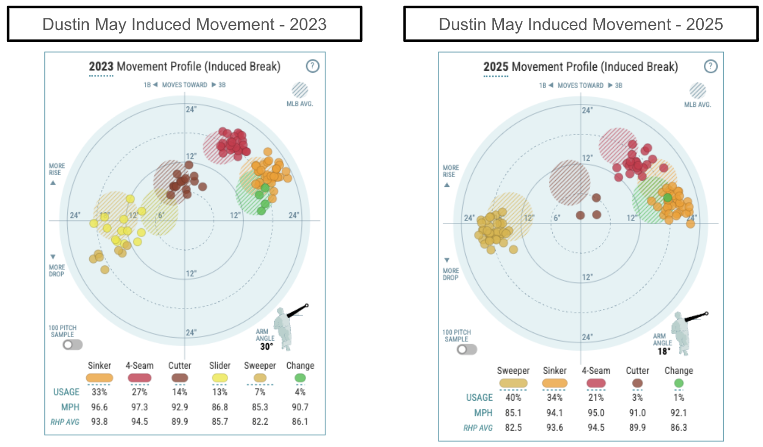 When pitchers have a lower arm angle, they likely have different release points. We discussed Dustin May's lower arm angle and release point changes early in April and during spring training. May has a career-low vertical release point, over 4.5 inches (4.7) lower than in 2023. Meanwhile, his horizontal release moved nearly six inches (5.9) farther from his midline, similar to 2021 and 2022.