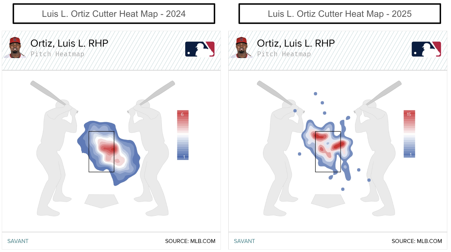Unfortunately, hitters have been crushing his cutter in the upper third of the zone in 2025 (.381 wOBA, .508 xwOBA) versus 2024 (.164 wOBA, .233 xwOBA). It's an uber-small sample, but the cutter elicits a 15.2 percent SwK in the upper third, higher than in 2024 (11.2 percent SwK). The cutter's goal should be to generate weak contact, but maybe the pitch doesn't matter if it continues to be crushed. Regarding whiffs, Ortiz's slider has been his best pitch, eliciting a 19.8 percent swinging strike rate (SwK).